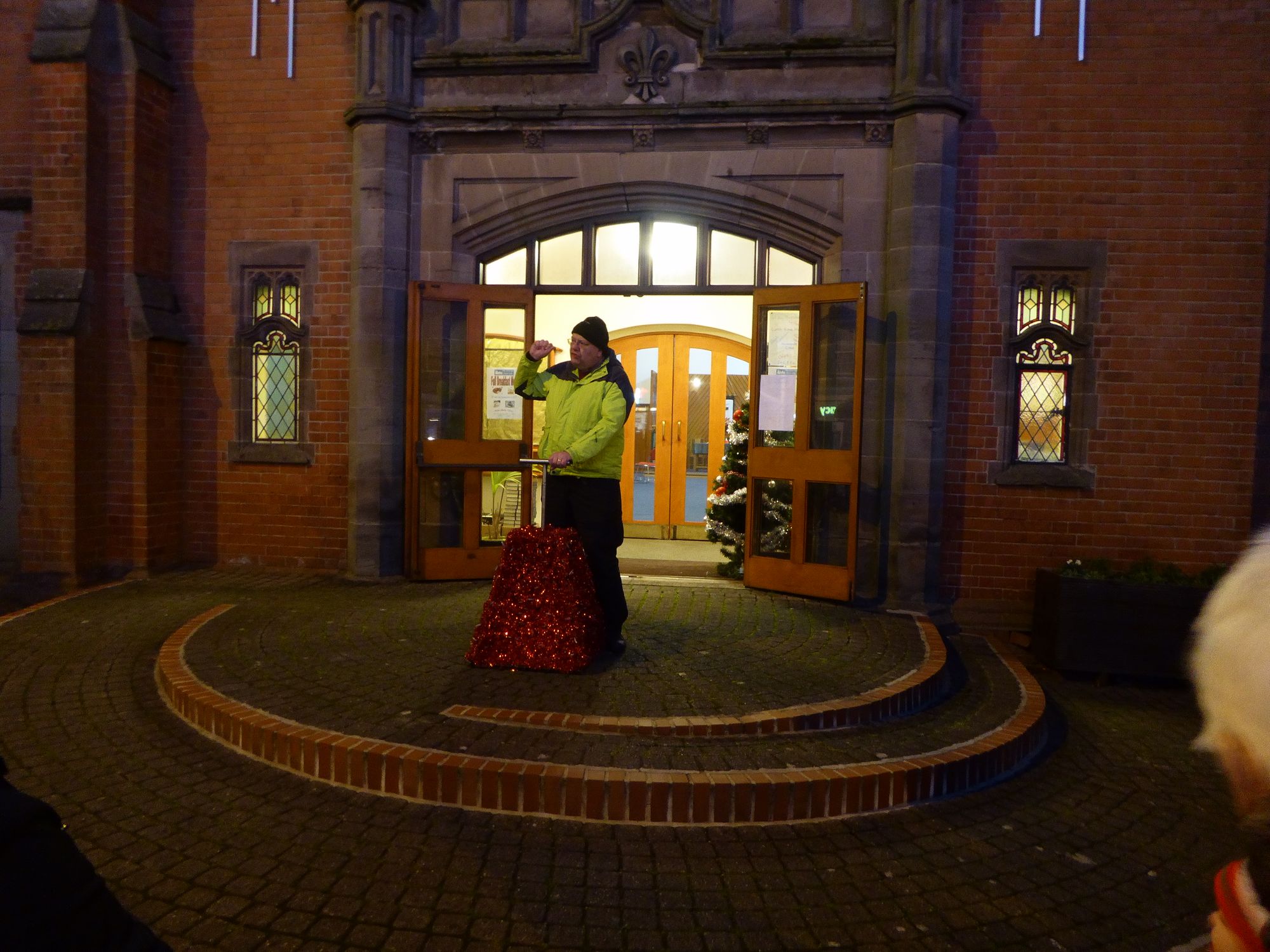 The 4th December saw the first switch on ceremony for a Christmas Tree and lights for many years. A group of families, passers by, faith leaders and local councillors gathered on the steps outside the Church to help turn the lights on. Rev Mike Claridge, Minister of the Cotteridge Church gave a brief talk about hope then everyone counted down from 10 – 1. After a moments pause a plunger was pushed and the 18ft Christmas Tree and surrounding lamp posts started to shine out with brightly coloured Christmas lights.