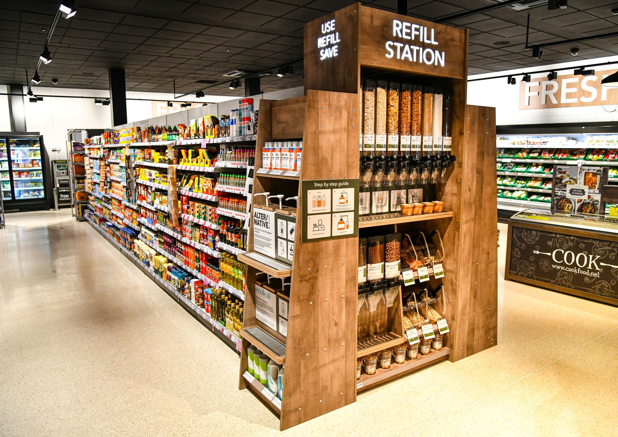 · New features inside such as zero-waste refill stations, one offering products such as cereals, coffee, pasta, rice and dried fruit, and a liquid refill station offering products such as shampoo, conditioner and washing up liquid. As part of a partnership with Fieldfare there is also ‘scoop your own’ frozen ingredients including a range of items such as pastries, Yorkshire puddings, Cornish pasties and fish cakes, all part of long-term efforts to cut down on plastic packaging and waste